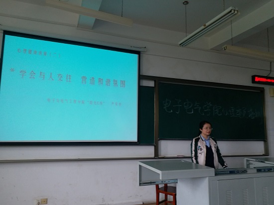4月26日下午,电子与电气工程学院“阳光E栈”在03-213进行了题为“学会与人交往、营造和谐氛围”的主题讲座。电子电气学院“阳光E栈”指导老师严荣华主讲,“阳光E栈”工作站人员和全体心理委员参加了此次讲座。
