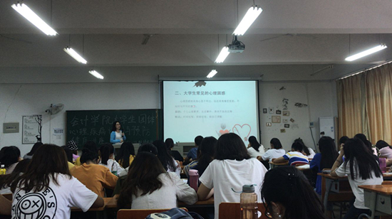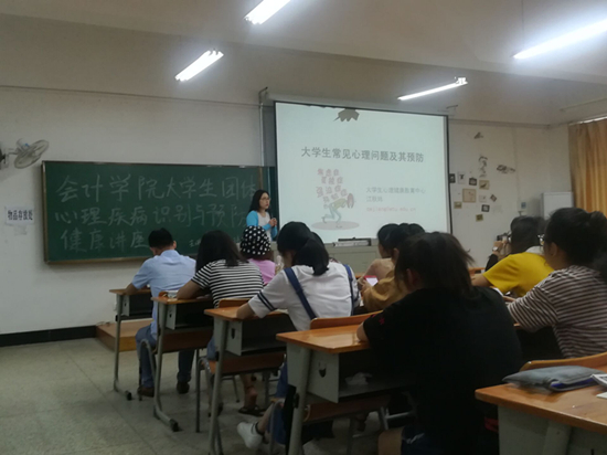 为了进一步加强我院学生的心理健康教育工作,2018年5月21日上午,由会计学院心理工作站会乐心苑主办的“心理疾病识别与预防”为主题的大学生心理健康讲座在07-202教室成功举办。本次讲座特邀了我校心理健康教育中心主任江秋玮老师为主讲嘉宾。学院各班的心理委员和大一学生参加了此次主题讲座。