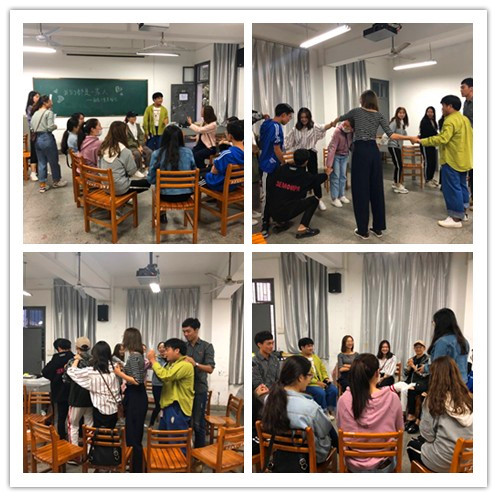 第四部分的“我想有个家”和“心有千千结”活动,使得整个培训活动带入高潮,同学们互相配合,支持与协作,并分享了活动的感悟。在“我想有个家”互动中,班助徐爽说到,这个游戏使他体验到归属感与主动接纳他人的重要性,只有主动学会与人交往,才能建立良好的人际关系。“心有千千结”部分,同学们都体会到团队协作的重要性,并将游戏中的“结”与生活学习上的“结”进行引申,引发大家思考与讨论。