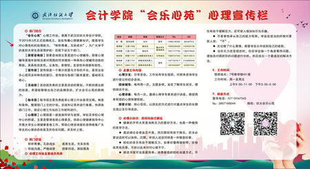 为增强大学生心理健康意识、帮助学生树立正确的心理健康观念,拓宽心理健康传播的途径,会计学院学生工作办公室外墙的会乐心苑心理宣传栏近日再次进行了更新。