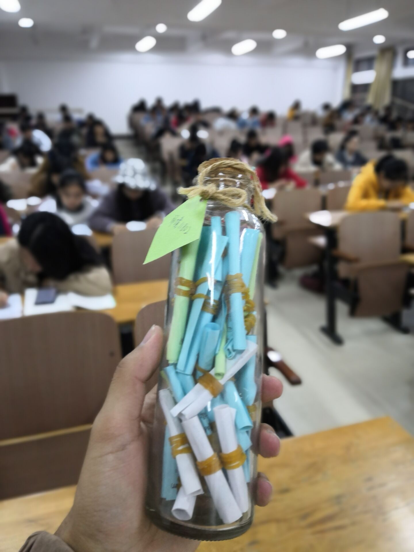 在了解活动流程之后,同学们纷纷提笔留言,气氛十分活跃。大多数同学都选择写给未来的自己,表达自己对今后四年的规划。时光胶囊活动是心理二级站的特色活动之一,大四毕业时再次翻阅自己入学时写下的信,让同学们回顾大学四年的成长轨迹,更能总结过去,开始新的征程。