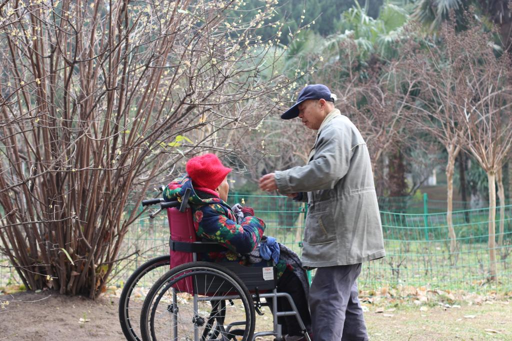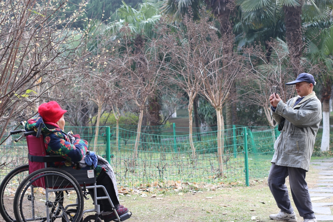 春暖花开,一位老爷爷给坐在轮椅上的老奶奶整理衣物之后,正从多个角度拍下她与美丽花朵的合影。年近百岁的老人,相濡以沫,相守相望。心怀感动地抓拍下这温馨一幕。