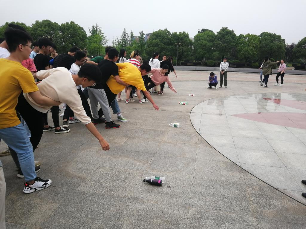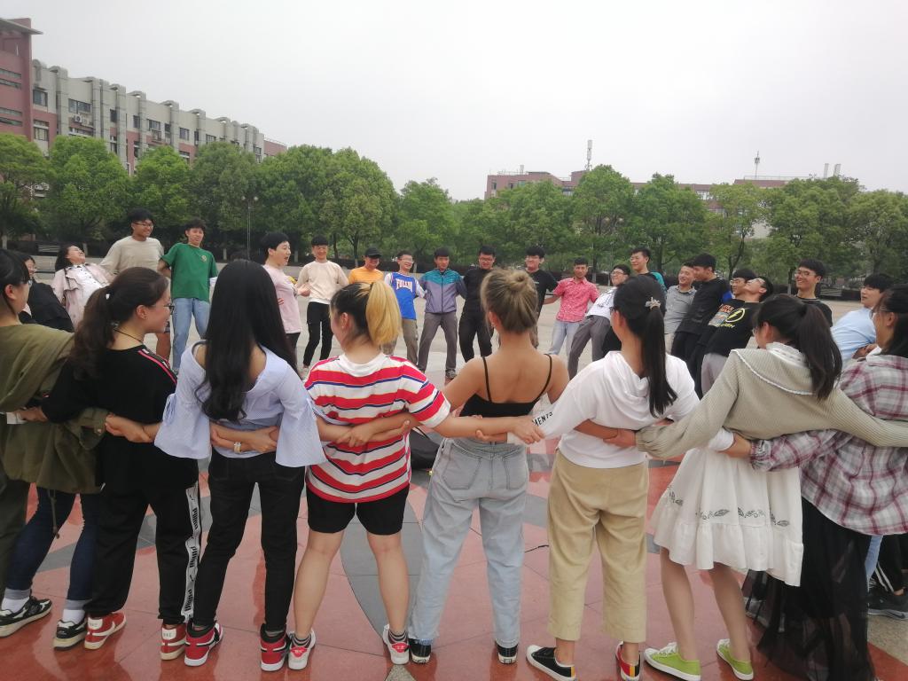 图书馆圆形广场上,化工11801、11802班同学围成一个圆圈,双手穿过相邻同学背后紧紧握在一起。“一,二,三,花开。三,二,一,花落。南风来,北风吹”在胡子英老师的口令下,同学们时而后仰,时而前倾,时而向左倾斜,时而向右倾斜。彼此之间的信任感在游戏中得到了增强。
