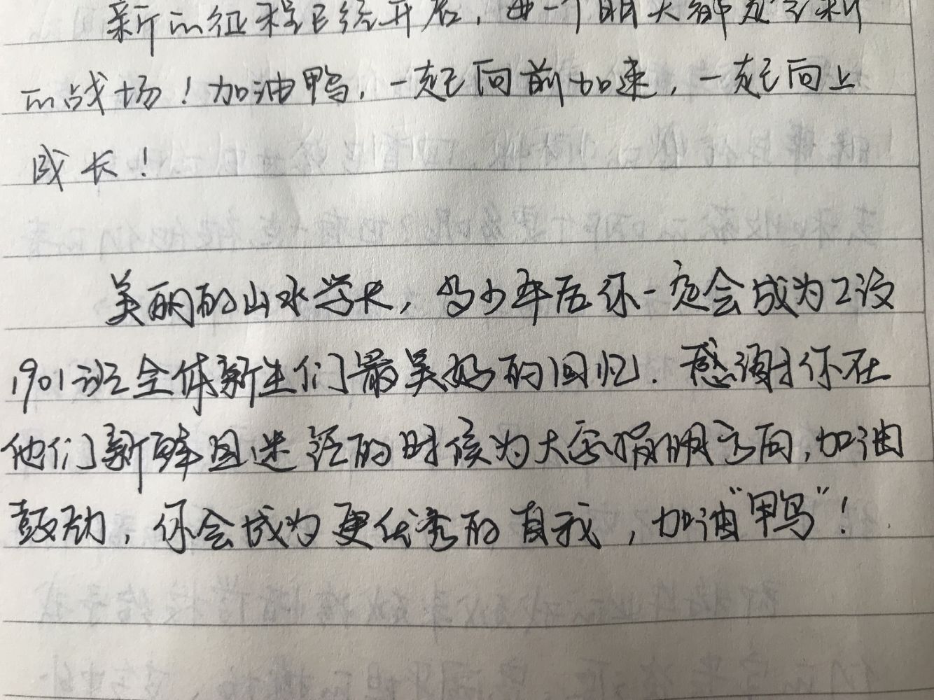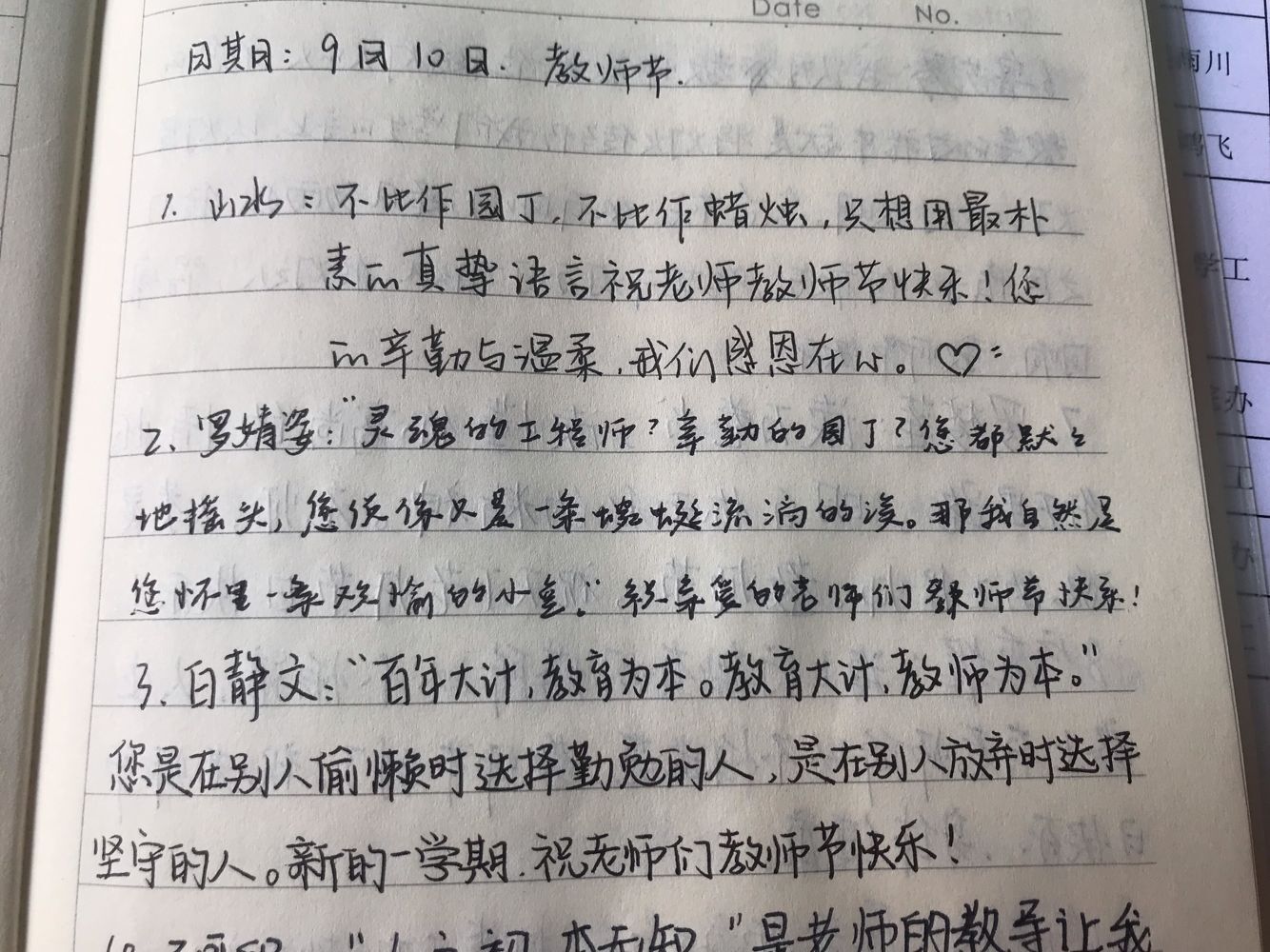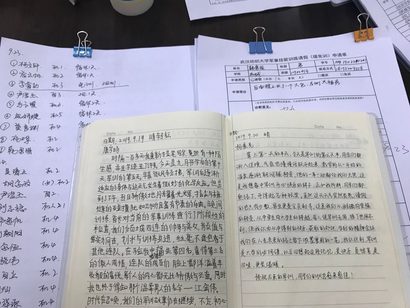 9月10日教师节,机械学院的19级新生们还在训练场上挥汗如雨地操练,但他们早已准备好教师节礼物:每人在班级日志上写下对老师们的祝福语!工设11901班的潘亚蕾同学写到:“虽然今天没有鲜花和掌声,也没有甜言蜜语,但是有我们对老师最真心的祝福!”