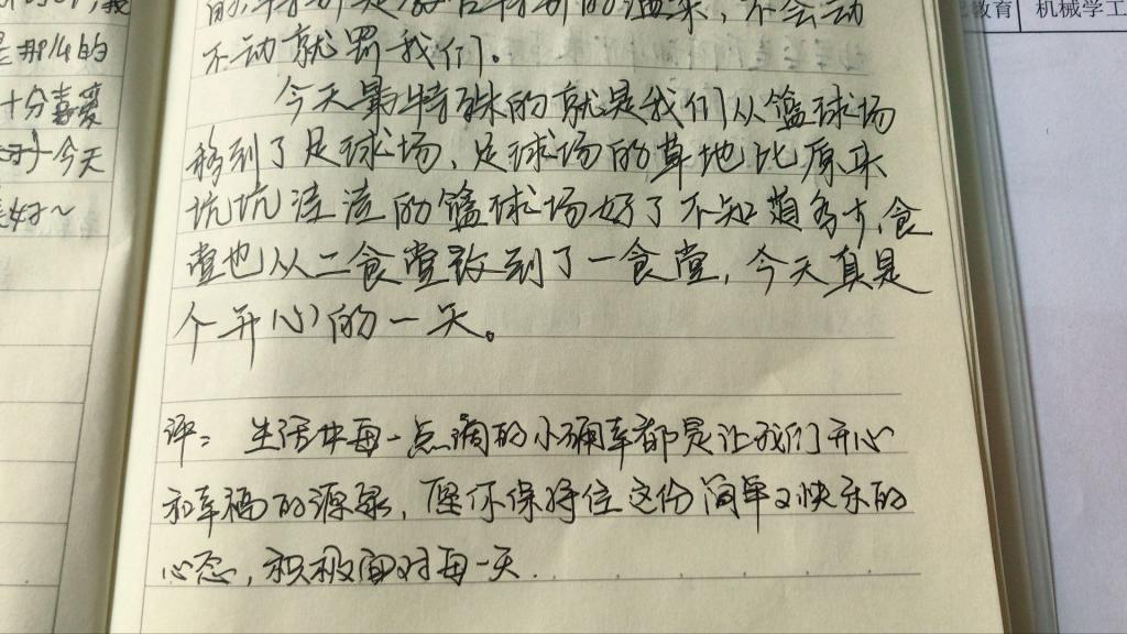 机械11902班罗婧资在日志里鼓励自己“新环境里小罗不要自闭,要做更好的自己”;机器人11901的白静文饶有兴趣地描述了开学第一天的“小意外”和令人激动的开学典礼;自动化11902的高云帆自豪地介绍了自己军训所在的“钢铁二连”;机械11904的工设的刘凯开心地表示今天教官终于带我们去一食堂吃饭了,训练场也从篮球场到了大操场,喜悦之情溢出纸面……