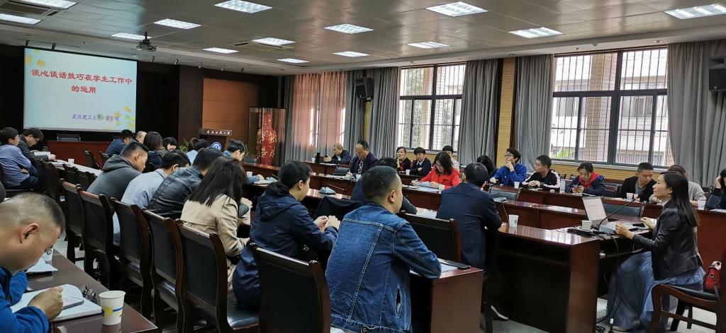 10月30日,为了进一步提高我校学生工作队伍的危机识别与干预工作水平,我校邀请湖北省大学生心理危机预防与干预专家、武汉理工大学心理健康教育中心副主任梁宇颂副教授在在行政楼115作“谈心谈话技巧在学生工作中的应用”专题培训。培训由校学生工作部副部长李琼瑛主持,学生工作部部长杜勇、各学院分管学生工作副书记、全体辅导员参加了此次培训。