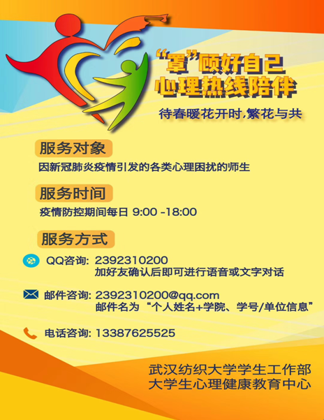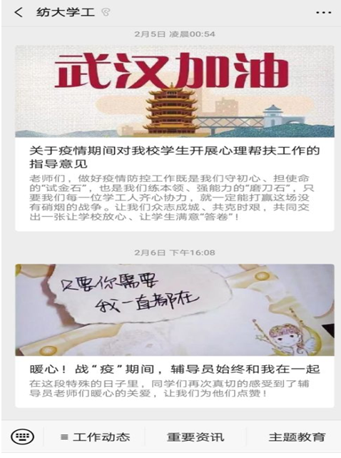 学工系统广泛运用纺大学工微信公众号以及各类QQ群、微信群宣传心理防护知识,引导学生正确面对疫情,帮助全校师生抵御心理恐慌。学生工作部积极组织全校师生参与国家教育部思想政治工作司开展的《关于加强高校疫情热线援助工作培训》,组织开展《2分钟自测疫情下你的心理是否健康!》心理测试,帮助师生了解自己的心理状态。