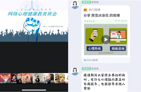 各年级辅导员主要依托QQ群、腾讯会议等平台,通过多种方式召开心理健康教育主题班会,普及关于疫情期间的心理健康知识,让同学们了解如何调适自我压力,克服恐惧和焦虑心理,照顾好自己,积极面对负面情绪。并介绍了湖北省高校心理专家服务支持热线、校心理健康教育中心咨询热线,引导有需求的同学主动联系寻求帮助。同时主动进行疫情发生之前就有心理预警学生的关怀和咨询,掌握此类学生在疫情期间的心理状况和生活状况,为需要帮助的学生提供必要的帮助。