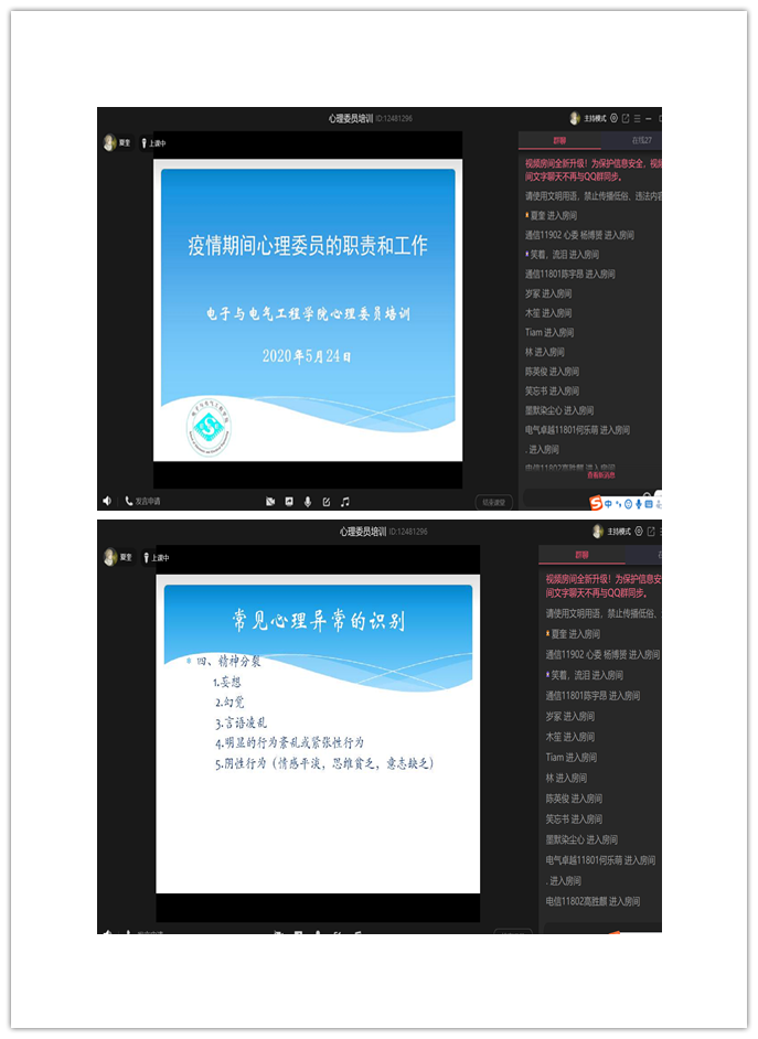 心理委员培训是电子电气学院“5·25”心理健康月系列活动之一,后期还将陆续开展“心理学知识基础”、“谈话与帮扶技巧”等专题培训,扎实做好疫情期间的心理健康教育工作,培育学生理性平和的健康心态。