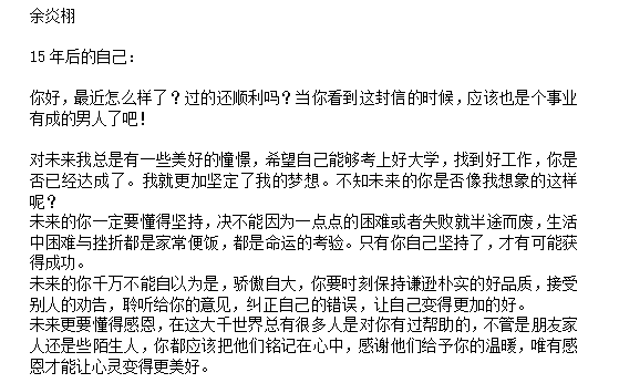 同学们积极投稿,对未来的自己都是满满的期待。李俊涛:“没有一次争取是一劳永逸地完成的,争取是一种每一天重复不断地行动,要一天又一天地坚持,不然就会不见。这是法国作家罗曼·罗兰的名言警句,为了你的梦想我和你必须要并肩作战,努力奋斗”。余炎栩:“未来的你一定要懂得坚持,决不能因为一点点的困难或者失败就半途而废,生活中困难与挫折都是家常便饭,都是命运的考验。只有你自己坚持了,才有可能获得成功。”