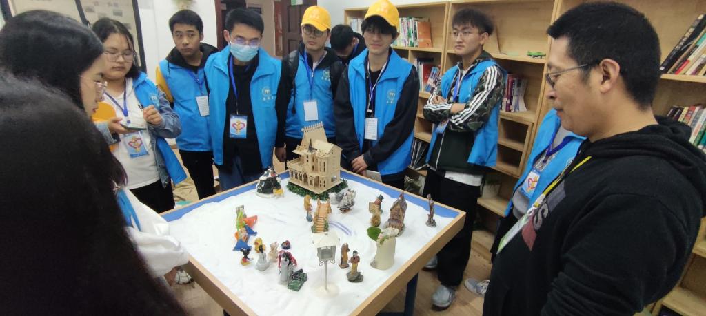 在参观沙盘室时,薛敏老师邀请现场同学参与体验,将自己心中的桃园展现出来。他说,通过沙盘游戏可以了解同学们的内心世界,并在现场根据学生们的作品分析了几位同学的性格。