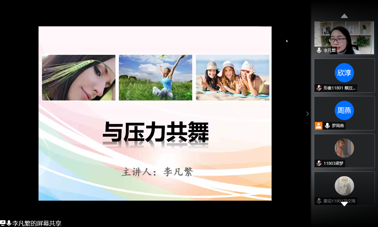 11月29日晚,服装学院邀请黄冈师范学院大学生心理健康教育与咨询中心副主任、国家二级心理咨询师李凡繁老师,在腾讯会议上给同学们带来一场心理健康教育讲座-----“与压力共舞”。学院近200名学生参加了此次讲座。