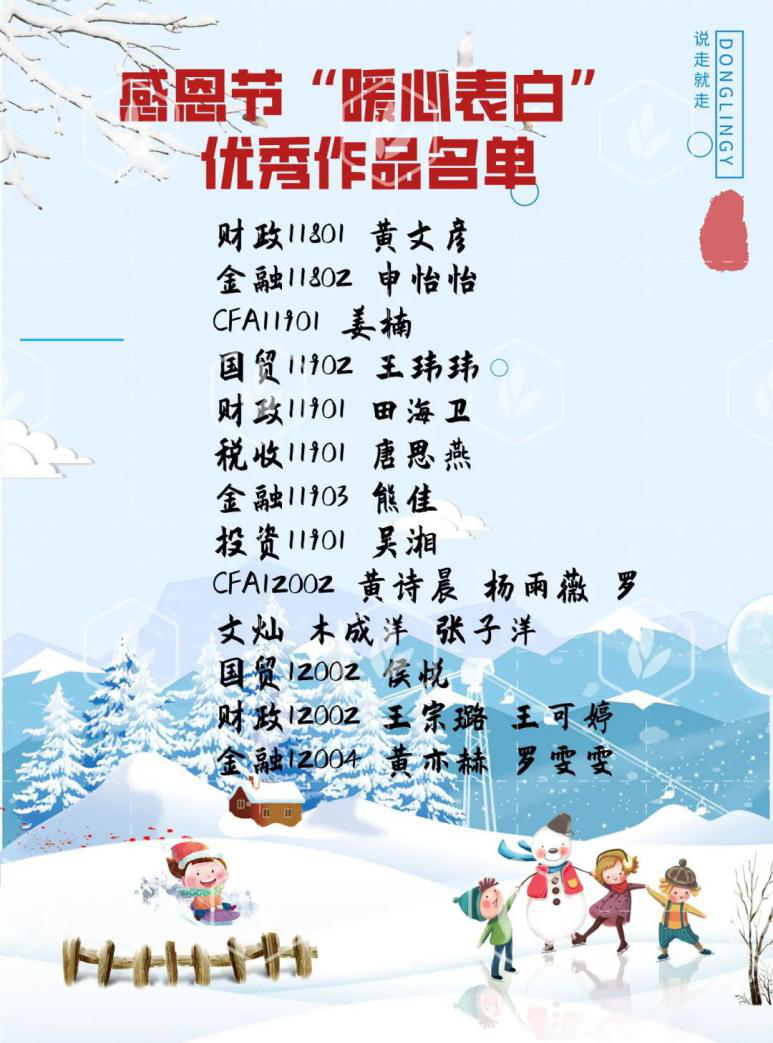 寒冬渐渐来临,而十一月的第四个星期四是暖气腾腾的“感恩节”,经济学院心拓部组织开展了“暖冬告白”线上征稿活动。本次活动的主要目的是营造经济学院温暖氛围,引导同学们发现生活中的更多美好,让同学们发现身边人,珍惜当下,促进彼此之间心灵的交流,让同学们勇于表达自己的感情。