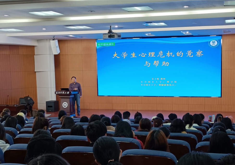 2021年3月12号上午,服装学院在南湖校区主楼T201举办主题为“大学生心理危机的觉察与帮助”的心理健康教育讲座。此次讲座特邀请华中师范大学心理学院教授、华中师范大学心理健康教育中心常务副主任,湖北省青少年心理健康教育中心副主任吴才智做专题报告,学院辅导员,各班心理委员、寝室长等三百多人参加了讲座。