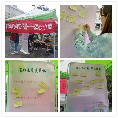 为提升同学们的心理健康水平,帮助同学们倾诉和解决日常生活中的困惑,4月21日-22日由服装学院心理工作站依心小屋在南湖校区食堂门口举办的“你的忧思,我来解”活动如火如荼地开展起来。