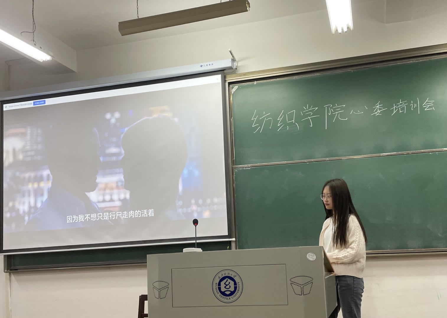 4月24日晚19:30分,纺织科学与工程学院学生会部门织心湾在三栋220教室开展心理委员培训会。主讲人由织心湾优秀干事郑佳佳与吕咏琳担任。虽然是第一次上台进行培训会的演讲,但二位女孩却没有丝毫的怯场,谈吐清晰,有条有理地为大家介绍了有关消极情绪的知识。