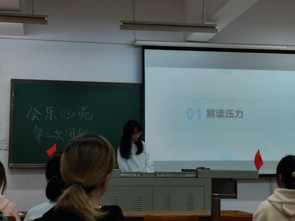 本次团辅培训主题为“与压力和解,和乐观牵手”。“会乐心苑”心理工作站成员首先带领全体心理委员一同解读压力,从心理症状、生理症状、行为症状三个方面阐述过重压力带来的消极影响,同时面向在场心理委员进行了压力小测试,帮助同学们了解自己目前的压力情况。